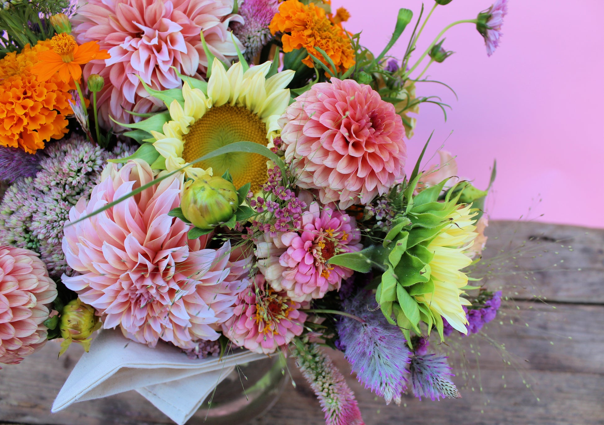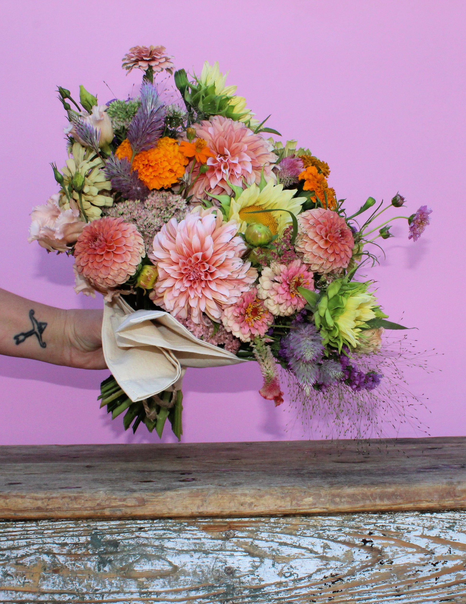 Our bouquets will give you or your loved ones the feeling of happiness and fragrance. If you want a burst of color in your life or someone else's, these beauties will turn heads. Filled with various flowers and greens, they will be adorned in a reusable bag or recyclable paper because we do not use plastic. We also deliver them in a reusable vessel with water; that way, they stay fresh, and there's no plastic involved. The bouquets are available in three sizes, small, medium, and large. The photos shown are examples based on shape, size, and price. No customizations; we make the bouquets using available seasonal flowers only.